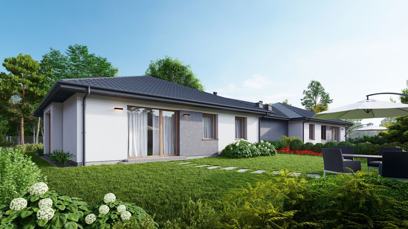Możliwość zaaranżowania poddasza według własnego projektu – powierzchnia łącznie około 60 m2. W ofercie znajdują się obecnie dwa budynki o lustrzanym układzie.